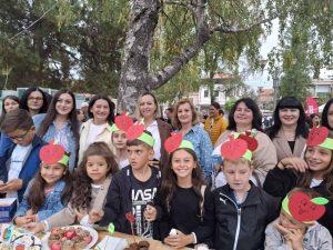🍎 Nxënësit e grupit klasor  të SHFK “Slavejko Arsov” – Podmoçan, së bashku me mësueset dhe prindërit e tyre, morën pjesë aktivisht edhe në këtë vit në Panairin e Mollës së Prespës.